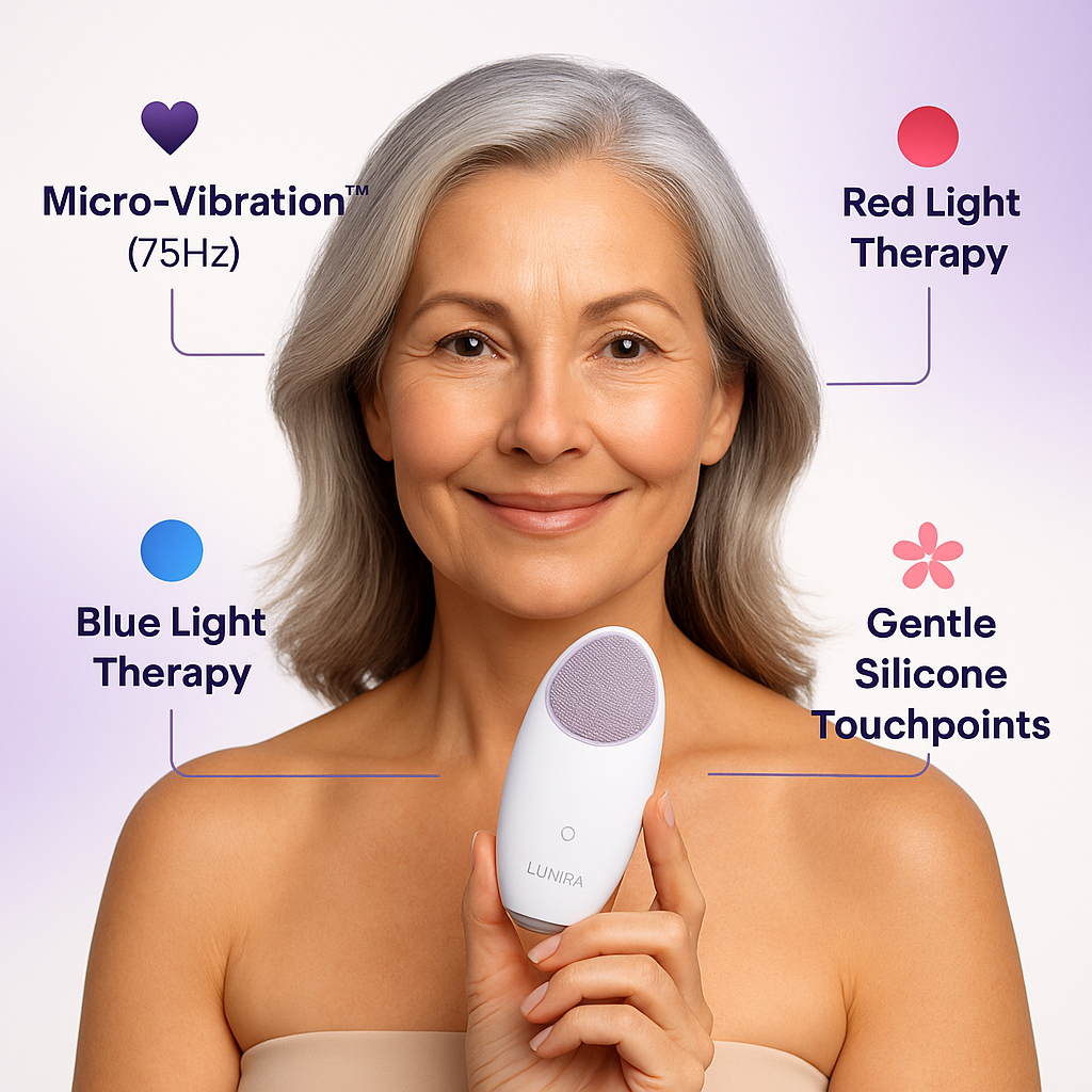 Yes — Lunira Radiance Pro™ was designed with sensitive and mature skin in mind. The silicone touchpoints are ultra-gentle, ensuring a deep cleanse without irritation. The red and blue light therapies are non-invasive and dermatologist-backed, making the device safe for daily use even on delicate skin.